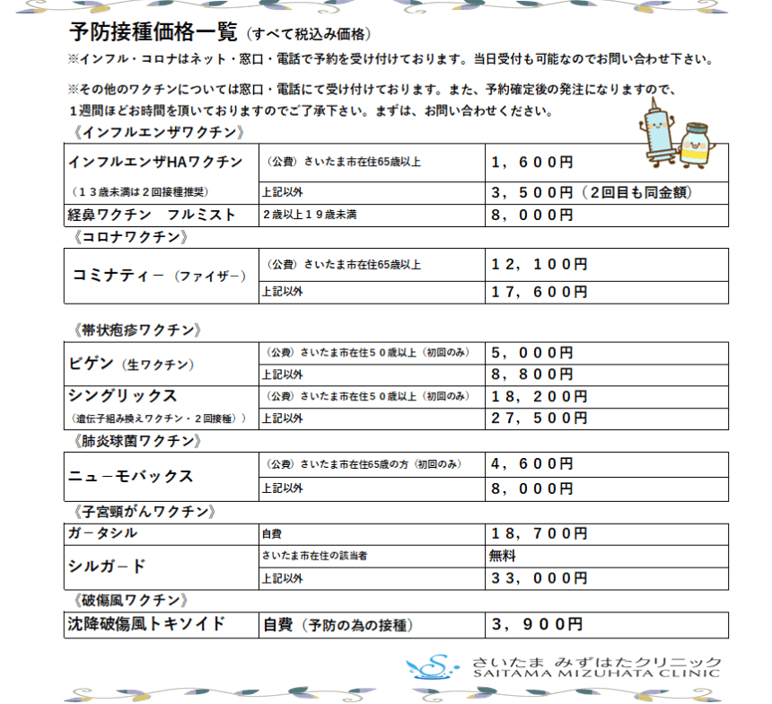 当院で受けれる予防接種の一覧